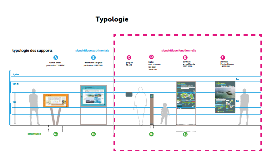 Création d’une signalétique patrimoniale extérieure qui relate l’Histoire pénitentiaire et coloniale. Création d’un signalétique fonctionnelle pour guider la visite depuis l’embarquement à Kourou et dans les sentiers de l’île.
